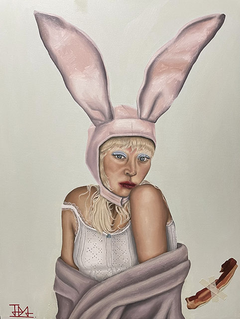 This piece is inspired by the film Gummo by Harmony Korine. The exploration of aggressive realism and the obscure corners of humanity in Gummo link to the depiction of the chaos of self-discovery in this piece. The smudged lipstick and bleached eyebrows link to the desperation to find one’s true self through experimentation. The bunny ears link to a character called “Bunny Boy” who does not speak in the film, but symbolizes lost hopes and optimism in a town struck by disaster; there is a link to hope and optimism within self-discovery. And the bacon taped to the piece as seen in the film simply adds more confusion to again emphasize the chaos of identity.