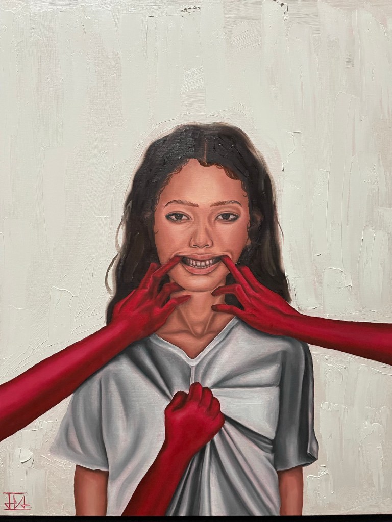 Dealing with mental illness or any kind of “invisible illness” can be difficult considering at first glance that no one knows what you’re going through except you. It can feel like you are isolated in a state of internal chaos. The hands in this piece are used to reflect the idea of faking a smile and the internal struggle with one’s own chaos. The red shade of the hands connotes the danger and pain the figure is going through, hence the cool and neutral tones in the rest of the piece.