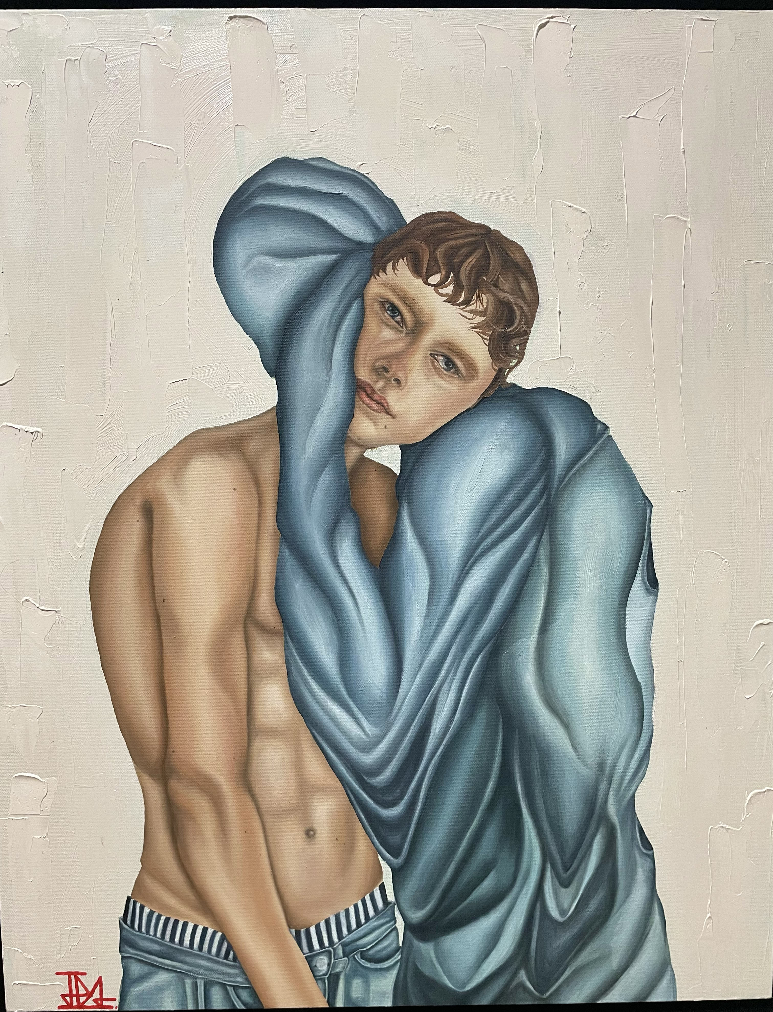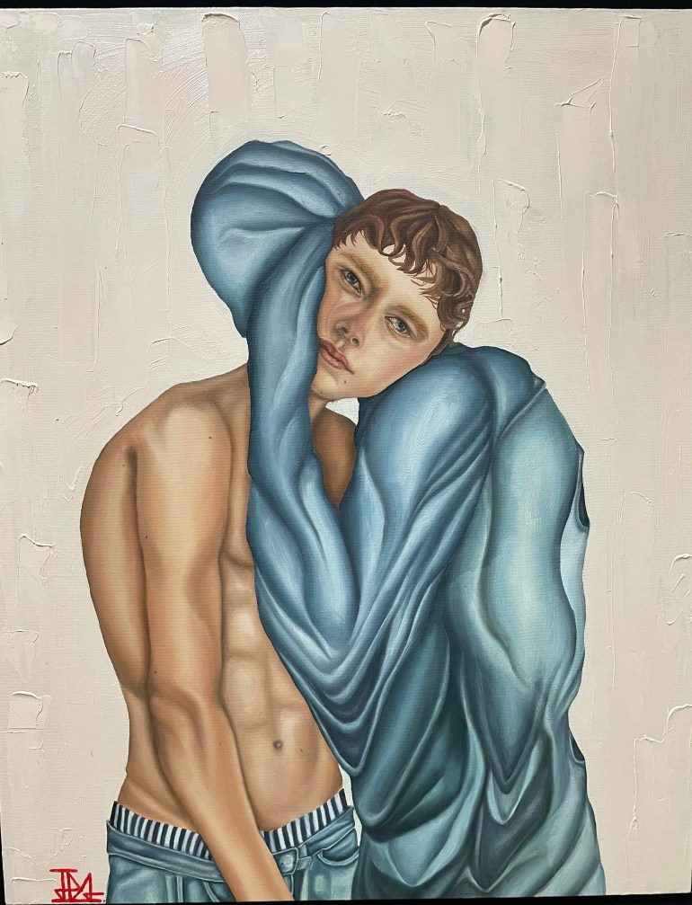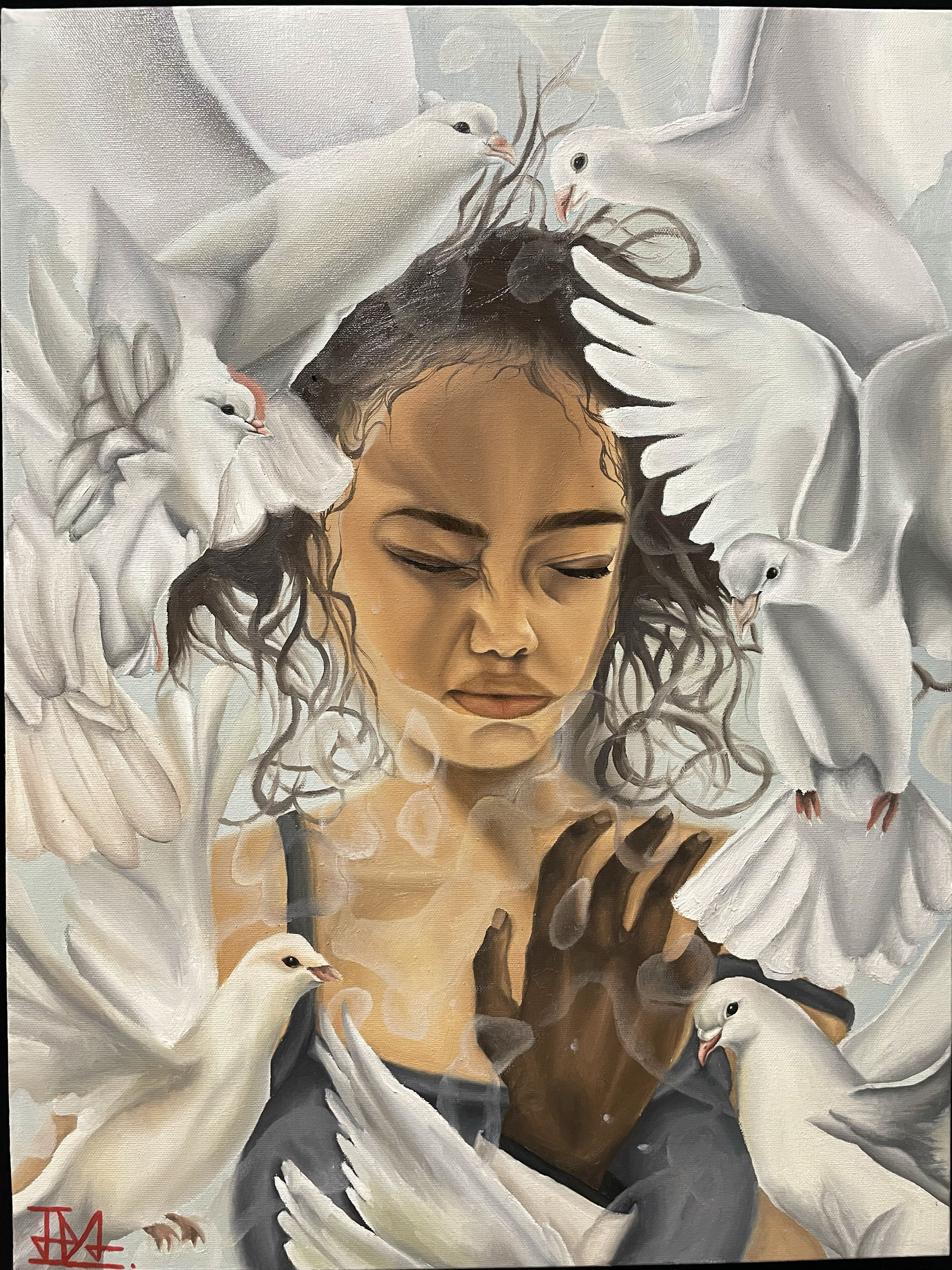 The oil paint in this piece is used to reflect the fluidity of the water the figure is being forcibly baptised in. The chaotic way in which the doves, which ironically represent peace and freedom, are illustrated links to my exhibition theme of chaos. They serve as a sensory overload for both the viewer and the figure. The neutral tones reflect the angelic mood of the piece. This piece is mainly inspired by my own struggle with my religious identity and how I have questioned the existence of some higher power throughout my life.