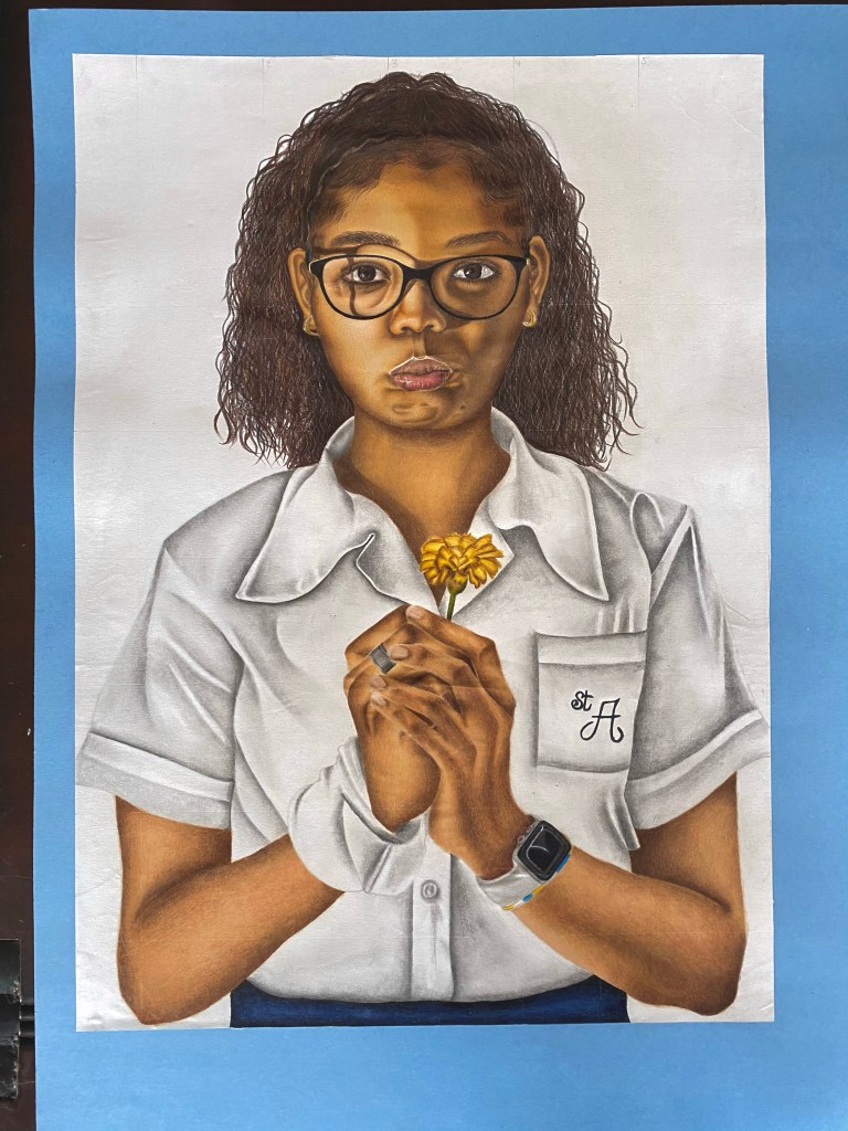 This piece is a hyperrealistic coloured pencil on canvas self-portrait. I created this piece from a reference. To create this piece I had to test my skills in realism and working with coloured pencils, which before the creation of this piece I was not fully comfortable with.