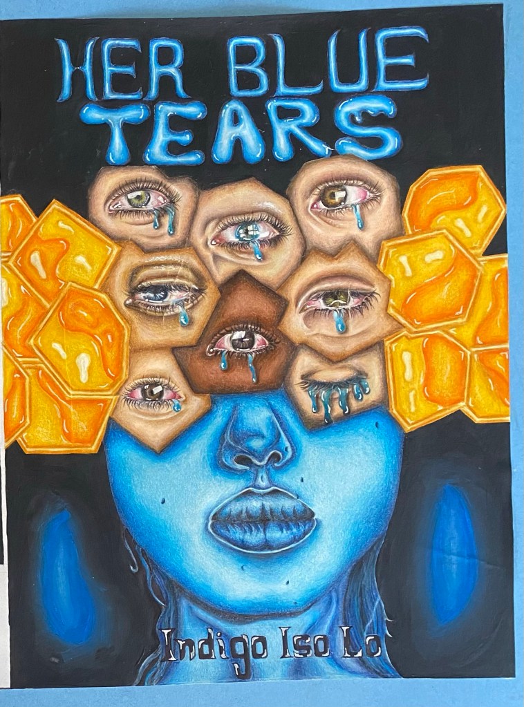 I created this coloured pencil on paper piece as a book cover for an imaginary book called “Her Blue Tears”. The concept behind the book was a girl looking for her missing sister in a large city. The eyes are meant to symbolise how people can so easily disappear despite the many people around them. I also used a honeycomb around the eyes to symbolise truth and healing, as honey is often used as a form of medicine. The shades of blue used in the title and figure in this piece are meant to connote the sadness that the main character feels as she struggles to find her lost sister.