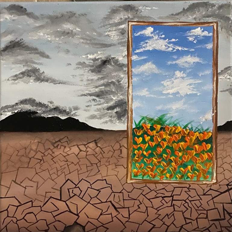 This acrylic on canvas piece is meant to represent the concept of calm within the storm. The mirror in this photo shows a reflection of an ideal world which contrasts the world outside of the mirror. The ground in the world outside of the mirror is cracked and dry, the sky is grey, and there is no sign of life. This piece generally shows an escape from gloom into beauty. The vibrant colours and texture of the flowers and clouds in the mirror world are also meant to draw the viewer in, making it even more clear that this is an ideal world.