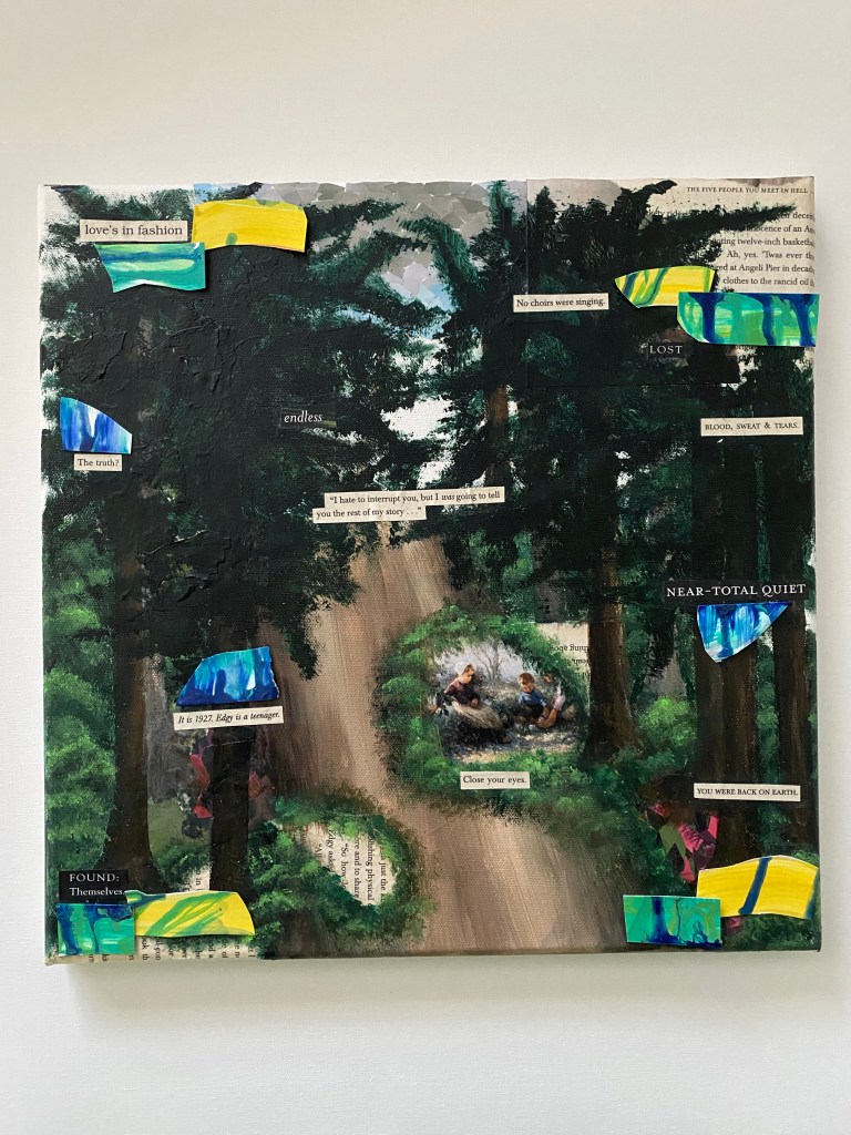This mixed media piece is a representation of the world I believe a character created based on the colour Crimson may live in. I utilised paper cutouts as well as cutouts from magazines and books to create a collage-like effect for this piece. I also found phrases from magazines and books that I believed represented human senses like smell, hearing, and touch, as well as identity. Although this piece Is a landscape it is relatively abstract conceptually and allows the viewer to interpret it in whatever way they choose.