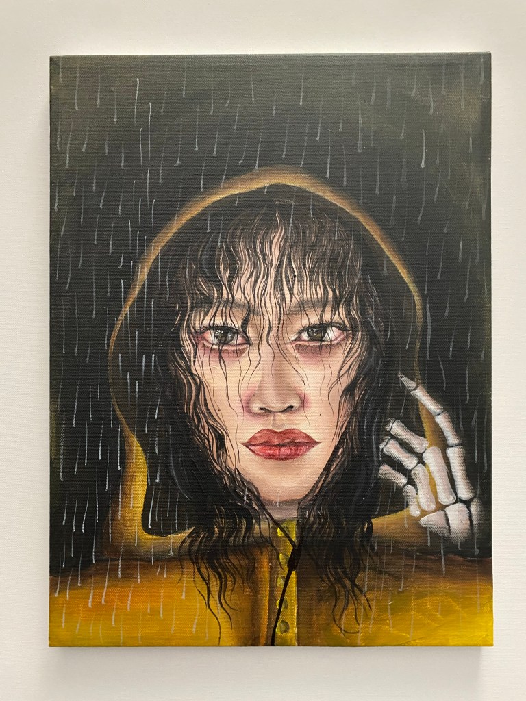 This acrylic painting is a depiction of one’s efforts to silence their own internal chaos. This piece was inspired by a dream I once had about walking down the street in the rain and not being able to turn around to see what was behind me. The title “Pink Noise” is a reference to where on the frequency spectrum the sound of rain falls. The figure in this painting is using “pink noise” to drown out the chaos of their own mind and surroundings as illustrated in the skeleton hand emerging from darkness. The cool tones contrast the warm tones in this piece to evoke a sense of unease.