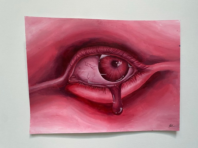 I created this monocromatic piece to test my ability to work with different shades of one colour for a whole piece. This piece is called “The Rose Window” as a play on the phrase “the eyes are the windows to the soul”. This piece allowed me to explore a very realistic and detailed painting technique while contrasting that technique with an unrealistic colour palette.