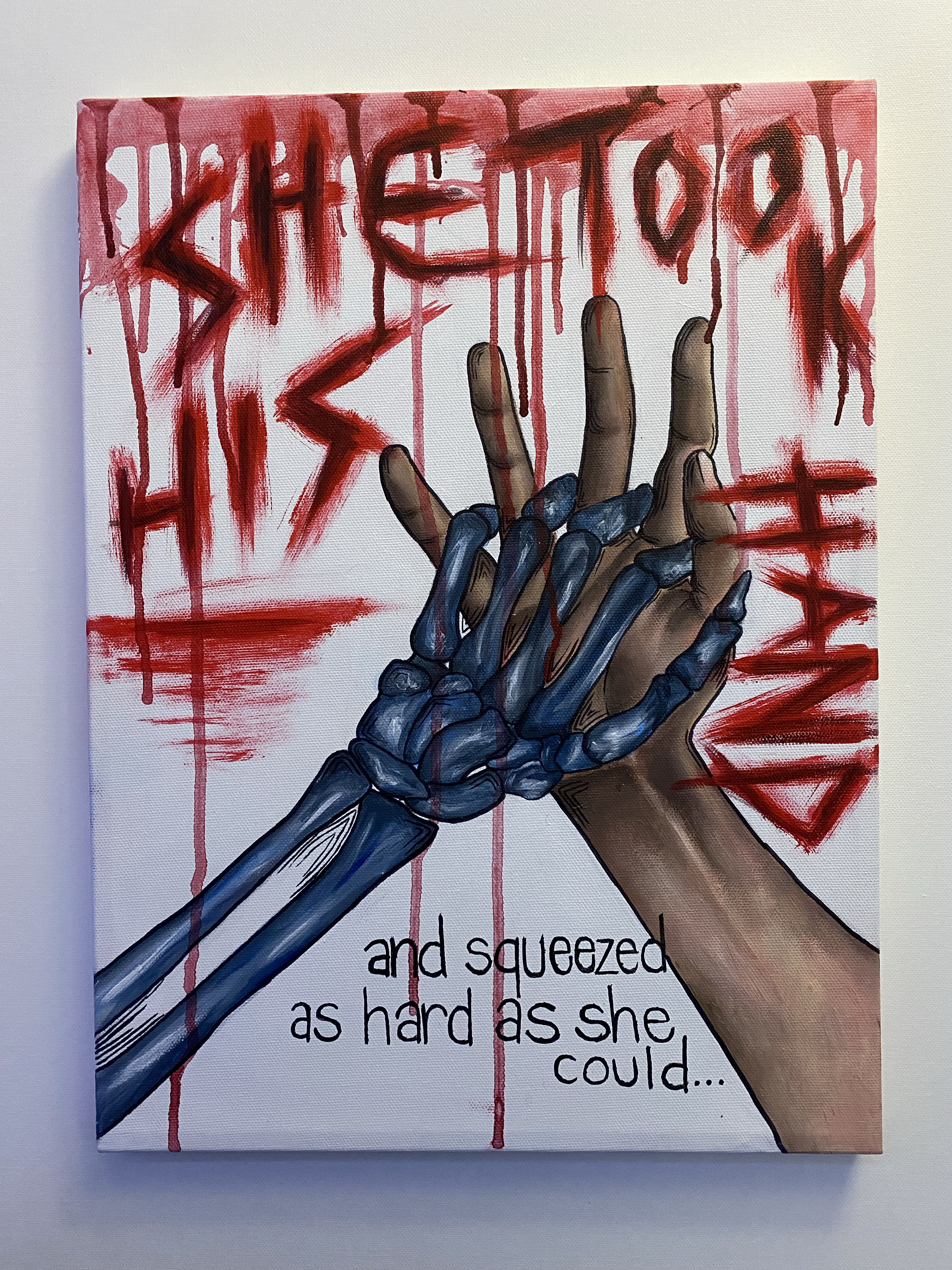 I created this acrylic on canvas piece based on the quote, “she took his hand and squeezed as hard as she could” which can be seen in the piece. The concept behind this painting is the idea of a one-sided relationship, where one person exhausts themselves emotionally and physically to keep a relationship intact as the other person continuously pulls away. I illustrated this concept by making the woman’s hand a skeleton to show that she is the one putting in all the effort and time. I also added red dripping paint to symbolise what the female figure put herself through to save her relationship.