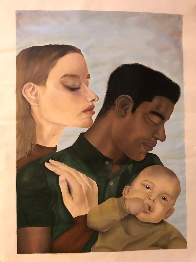 This oil and paper piece is meant to depict a biracial family. I also wanted to play with familial roles and decided to make the father seem like the more nurturing figure. This piece is meant to depict the beauty of diverse families, subverting the ignorant belief that people should marry within their own race. This piece shows that love is boundless, and that any two people that love each other can create a beautiful family regardless of race or gender. The natural and cool tones in this piece create a calm mood and emphasize the peace and natural beauty that this family holds.